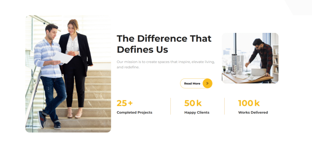 alongside an additional image, a strong call-to-action button, and performance counters displayed neatly at the bottom to highlight key achievements.