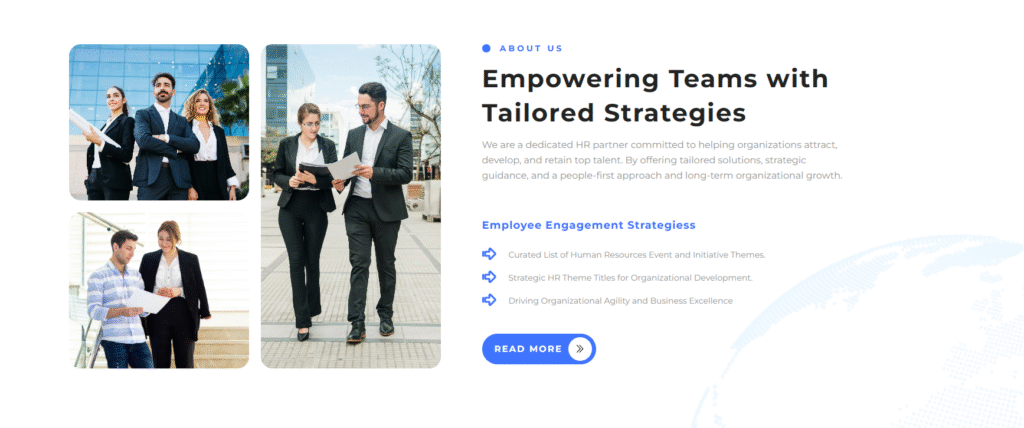 Module overview : About Company : This section is designed with a clean, engaging layout where the left side showcases multiple visually