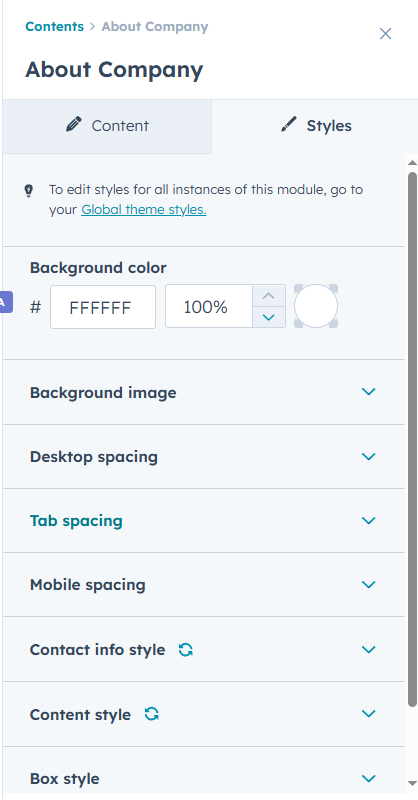 The HubSpot module’s “About Company” is fully customizable, allowing you to easily adjust background