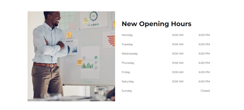 Variation 2 – Modern Split Section : Combines business hours with a strong feature image layout.