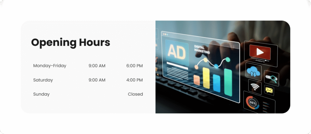 Ideal for highlighting new or updated opening hours. Keeps day and time content clear and structured.