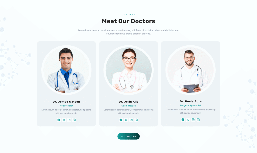 Showcase multiple team members with customizable details. You can change each member’s image, name, job role, description, and social media links. Includes a CTA button with hide/show options — when clicked, it takes users to the team member’s detailed info page.