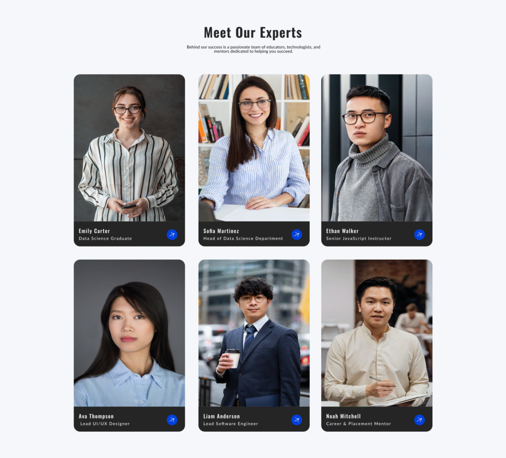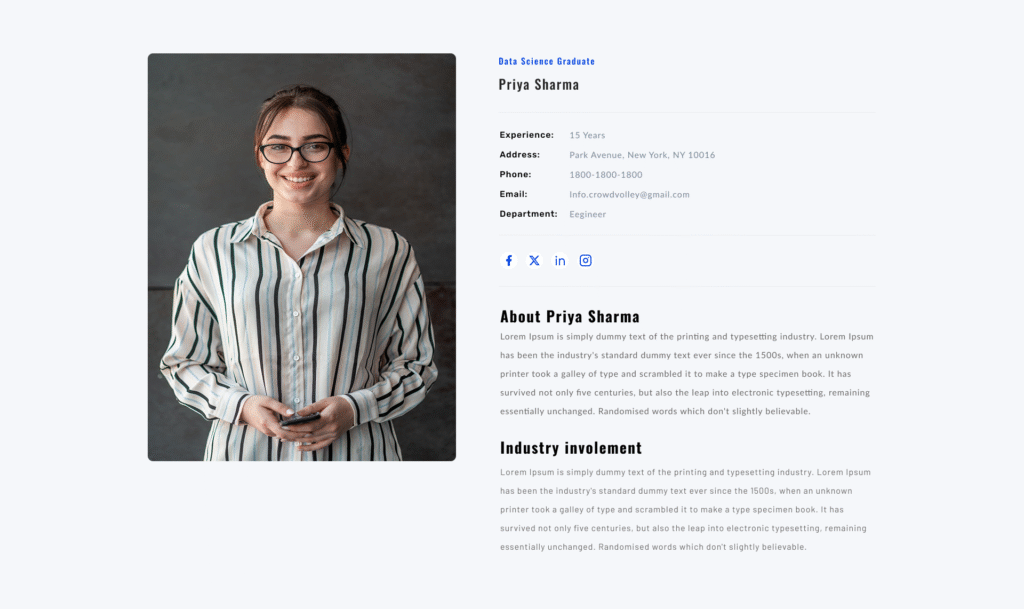 A customizable team details section where you can set the section subtitle, heading, and add multiple team member profiles. Each profile includes a photo, name, designation, and key information such as experience, phone, email, and specialization. Clicking on any team member opens a detailed view with complete personal information.