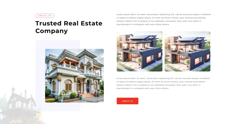 Showcase your business with a fully customizable About Us block. Easily replace the featured image, add side-by-side property photos, and edit every text element—from the heading to the supporting description. Adjust colors, fonts, and button styles to match your brand, creating a professional introduction that highlights your expertise and builds buyer confidence.