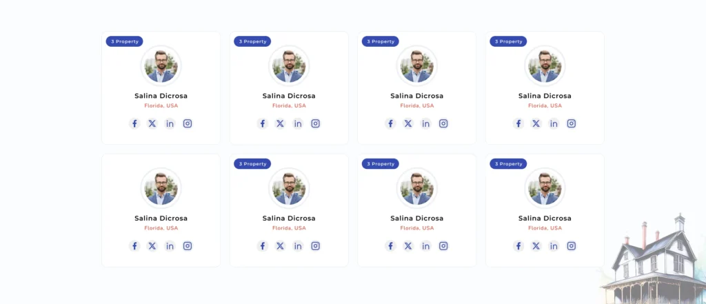 Present your real-estate professionals in a clean, grid-style layout. Each profile card can display the agent’s photo, name, location, and property count, along with clickable social media icons. Easily customize the background, text colors, and button styles to match your brand, giving visitors an attractive way to connect with your team and explore available listings
